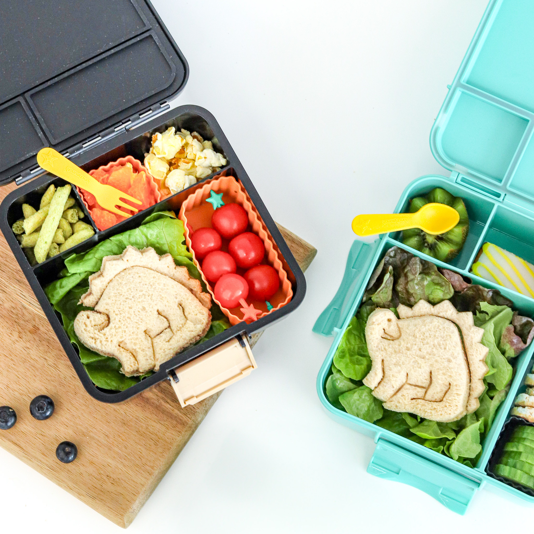 The Lunch Punch spoon and fork set is specifically designed to fit perfectly into popular bento boxes. This compact cutlery provides a practical solution for children to easily eat their meal without spilling.
