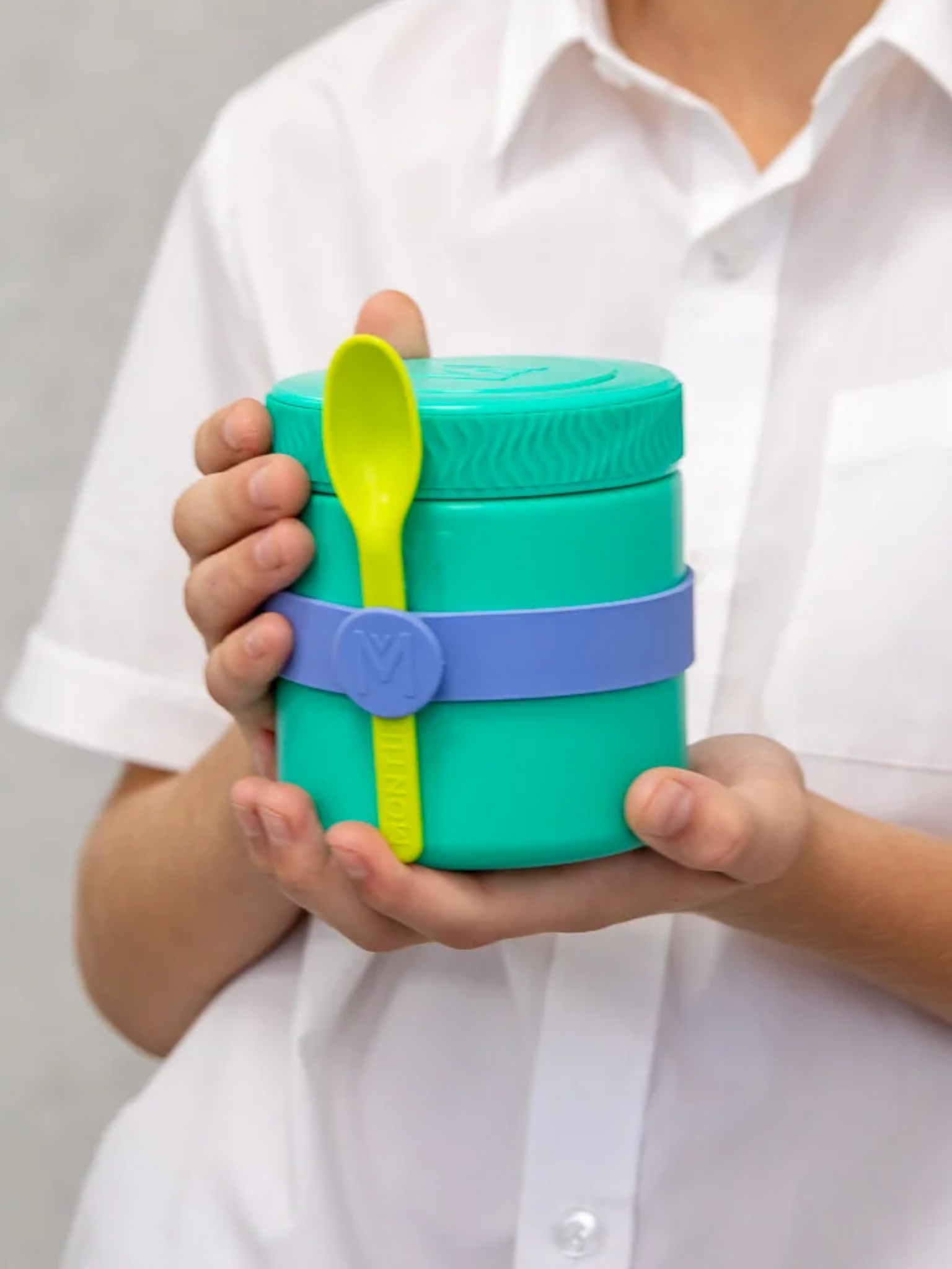 The silicone band for food jars keeps cutlery secure and is perfect for on-the-go. Simply slide the band over an insulated food jar or a snack box, such as the Bento Two.