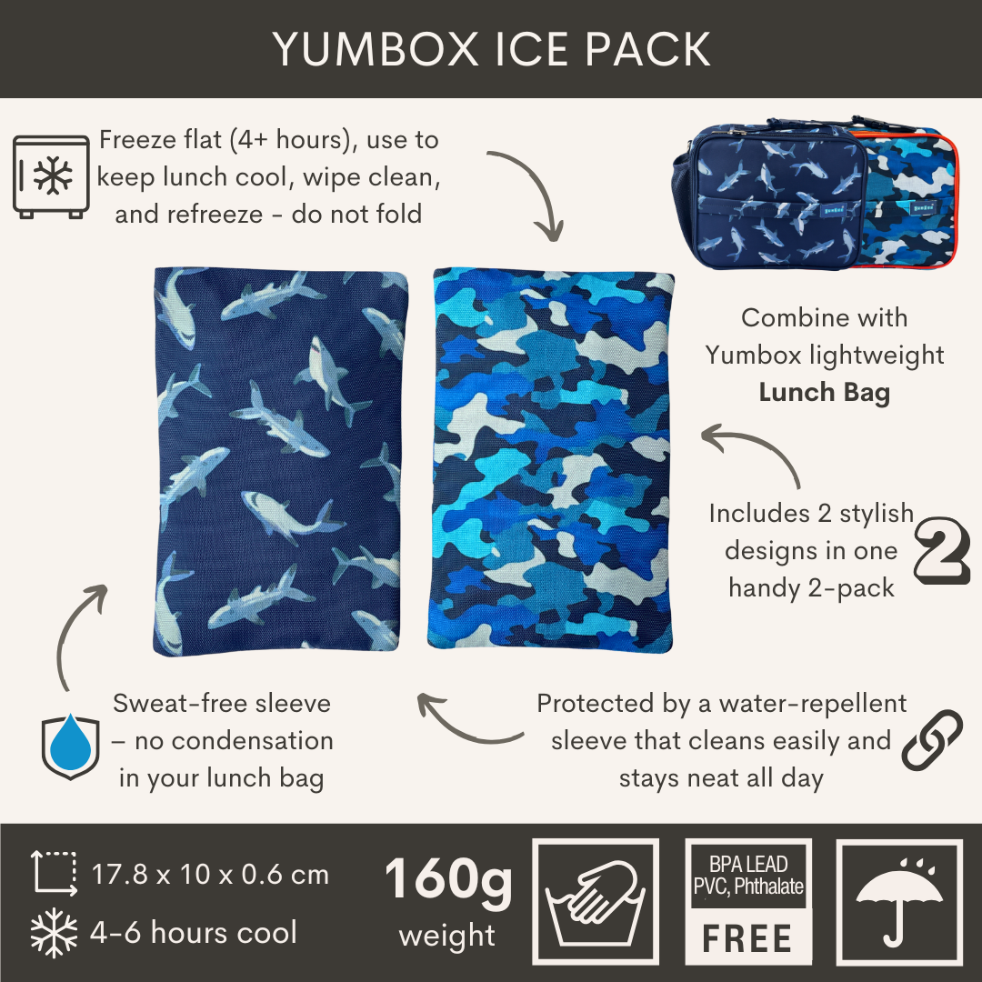 Yumbox Gel Ice Pack Duo - 4–6 hours cold – reusable – 2 designs - Shark & Camo