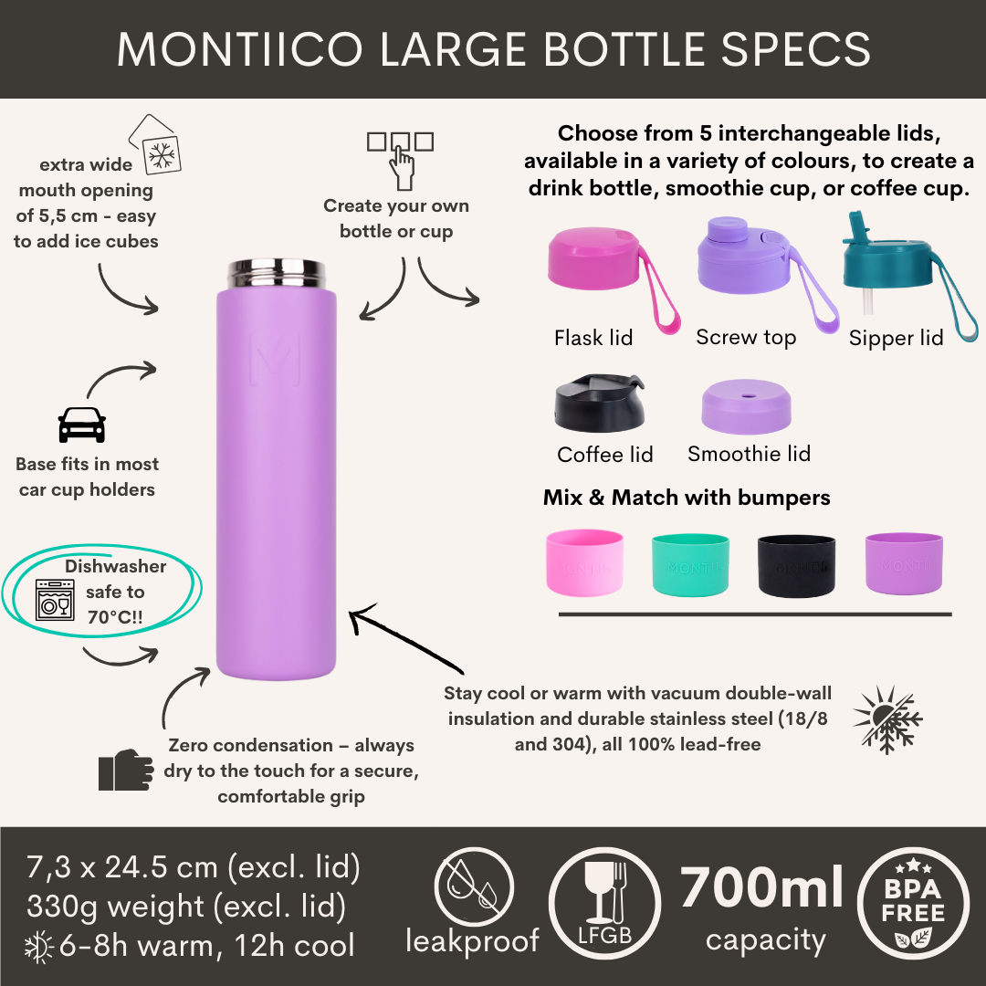 De MontiiCo 700 ml Thermosfles is ontworpen als een universele basis waarop de verschillende doppen passen. Kies zelf of je je fles wil gaan gebruiken als drinkfles, smoothie beker of als koffie beker. De fles is gemaakt van vacuüm geïsoleerd dubbelwandig roestvrij staal en houdt je drankjes tot 24 uur koud (zonder condensatie), of 8 uur warm. Natuurlijk is dit materiaal 100% lood- en BPA-vrij en vaatwasmachinebestendig. Door de grote opening is hij eenvoudig te vullen, ook praktisch wanneer je bijvoorbeeld ijsklontjes wil toevoegen.