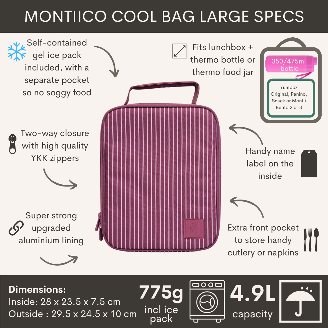 Praktische ruime tas met dikke isolatie om je eten langer koel en vers te houden. Het aparte vak voor het meegeleverde gel-ijspak voorkomt condensatie, zodat je voedsel droog blijft. MontiiCo gebruikt hoogwaardige, duurzame materialen die volledig zijn getest op kwaliteit en veiligheid.