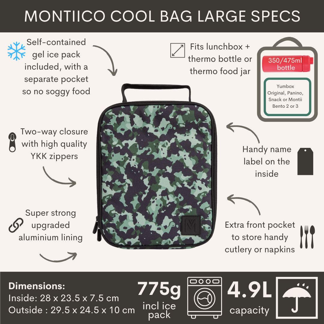 Praktische ruime tas met dikke isolatie om je eten langer koel en vers te houden. Het aparte vak voor het meegeleverde gel-ijspak voorkomt condensatie, zodat je voedsel droog blijft. MontiiCo gebruikt hoogwaardige, duurzame materialen die volledig zijn getest op kwaliteit en veiligheid.