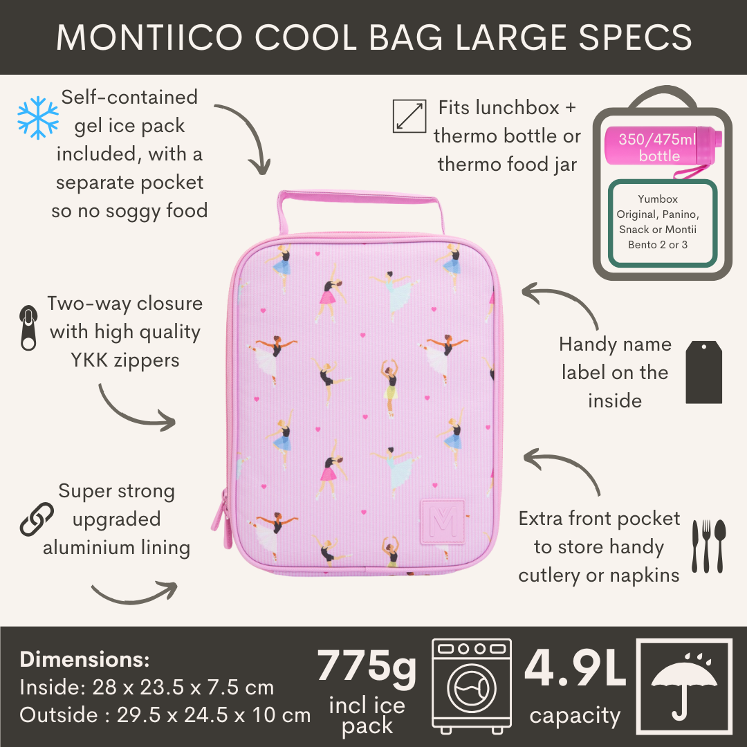 Praktische ruime tas met dikke isolatie om je eten langer koel en vers te houden. Het aparte vak voor het meegeleverde gel-ijspak voorkomt condensatie, zodat je voedsel droog blijft. MontiiCo gebruikt hoogwaardige, duurzame materialen die volledig zijn getest op kwaliteit en veiligheid.