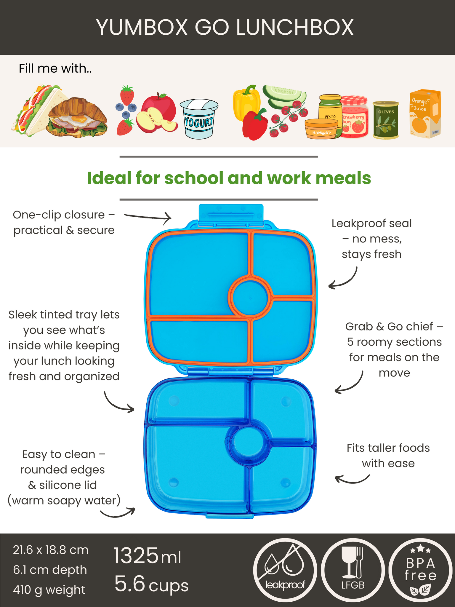 De Yumbox Go is ontworpen voor wie graag gezond en gevarieerd eet – op school, op het werk of onderweg. Dankzij de slimme vakindeling met 5 diepe compartimenten neem je moeiteloos een complete lunch mee, zonder dat smaken of ingrediënten zich vermengen.