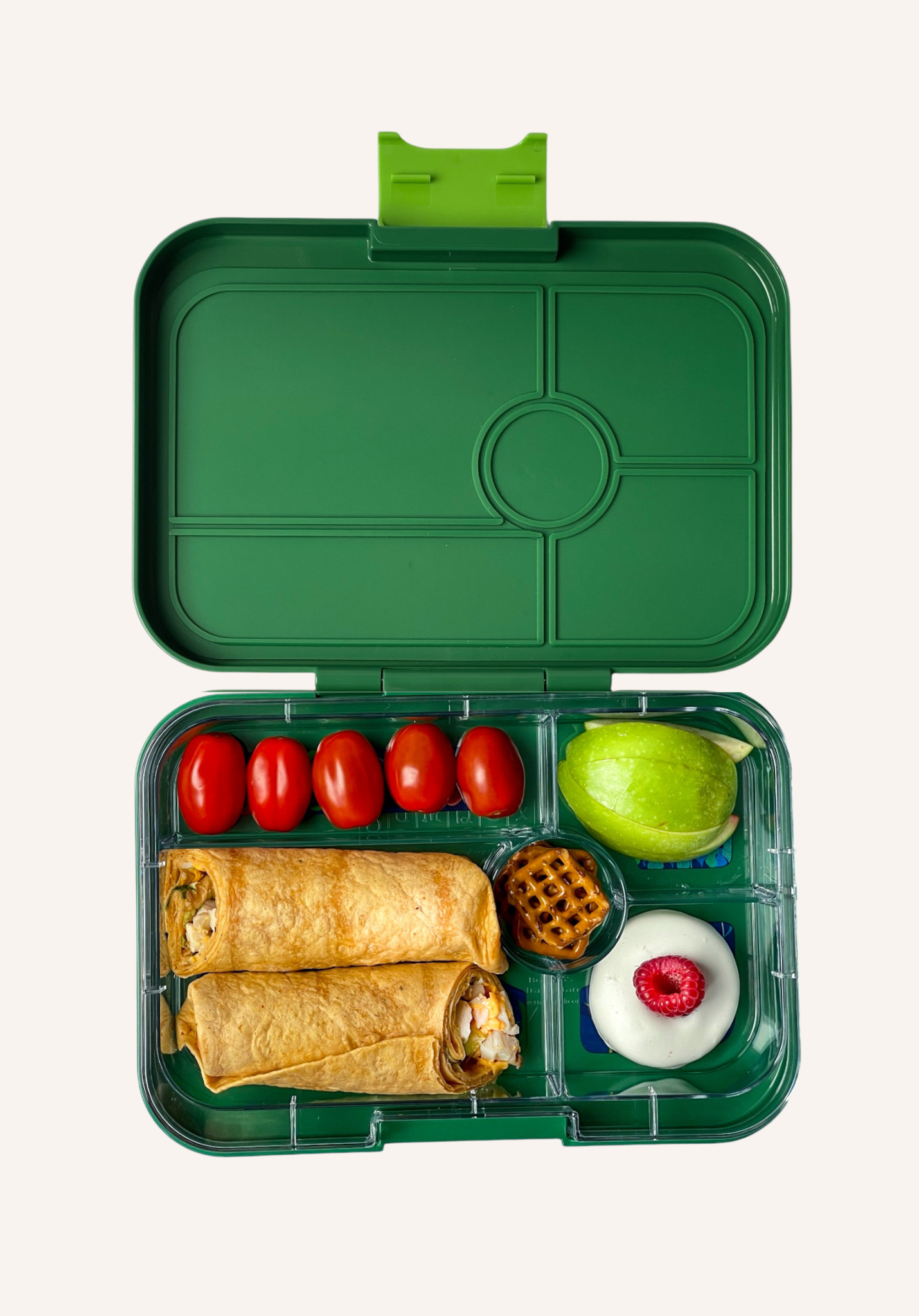 Met vijf handige compartimenten stel je eenvoudig een evenwichtige lunch samen – van boterhammen of wraps tot groente, fruit, noten, crackers, yoghurt of dips. Dankzij het lekvrije siliconen afsluitmechanisme blijven ook vloeibare etenswaren zoals yoghurt, hummus of appelmoes netjes op hun plek. Alles blijft lekker vers, en zelfs gesneden appel verkleurt minder snel. Let op: deze Yumbox is niet geschikt voor dunne vloeistoffen zoals water of sap.