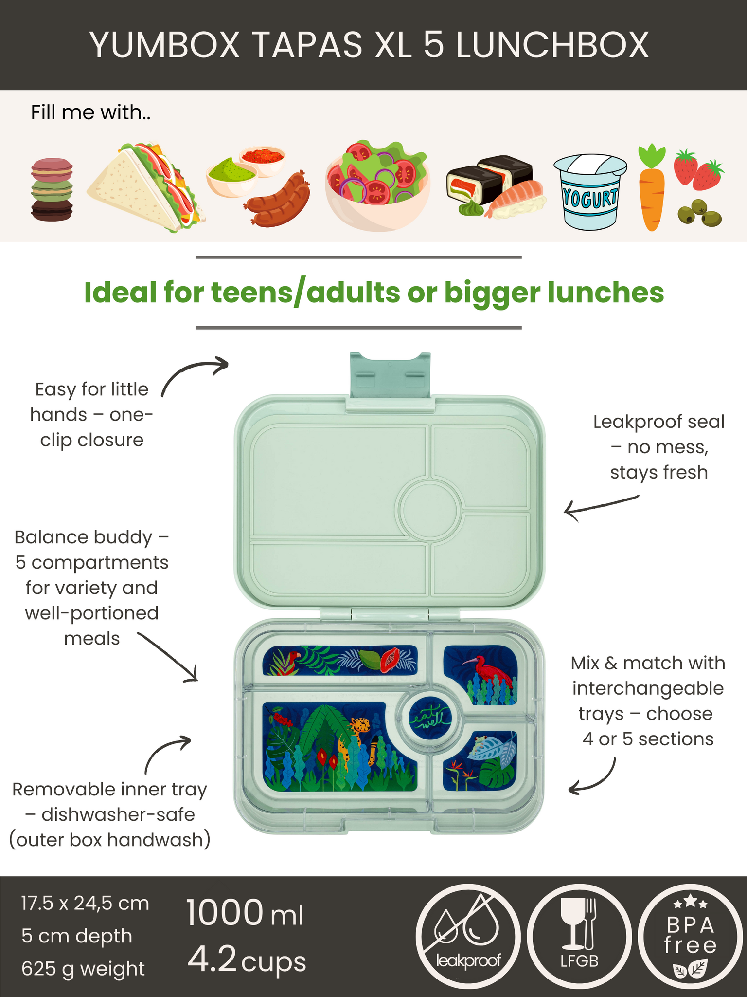 Yumbox Tapas XL - lekvrije Bento box lunchbox - 5 vakken - Pistachio Green / Jungle tray